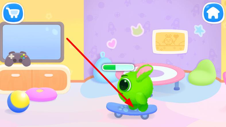 3、来到客厅场景,找到踩在滑板上的宠物,点击滑板或宠物本体,触发滑板互动玩法,操控宠物滑行、做出特技动作,丰富养宠日常乐趣。