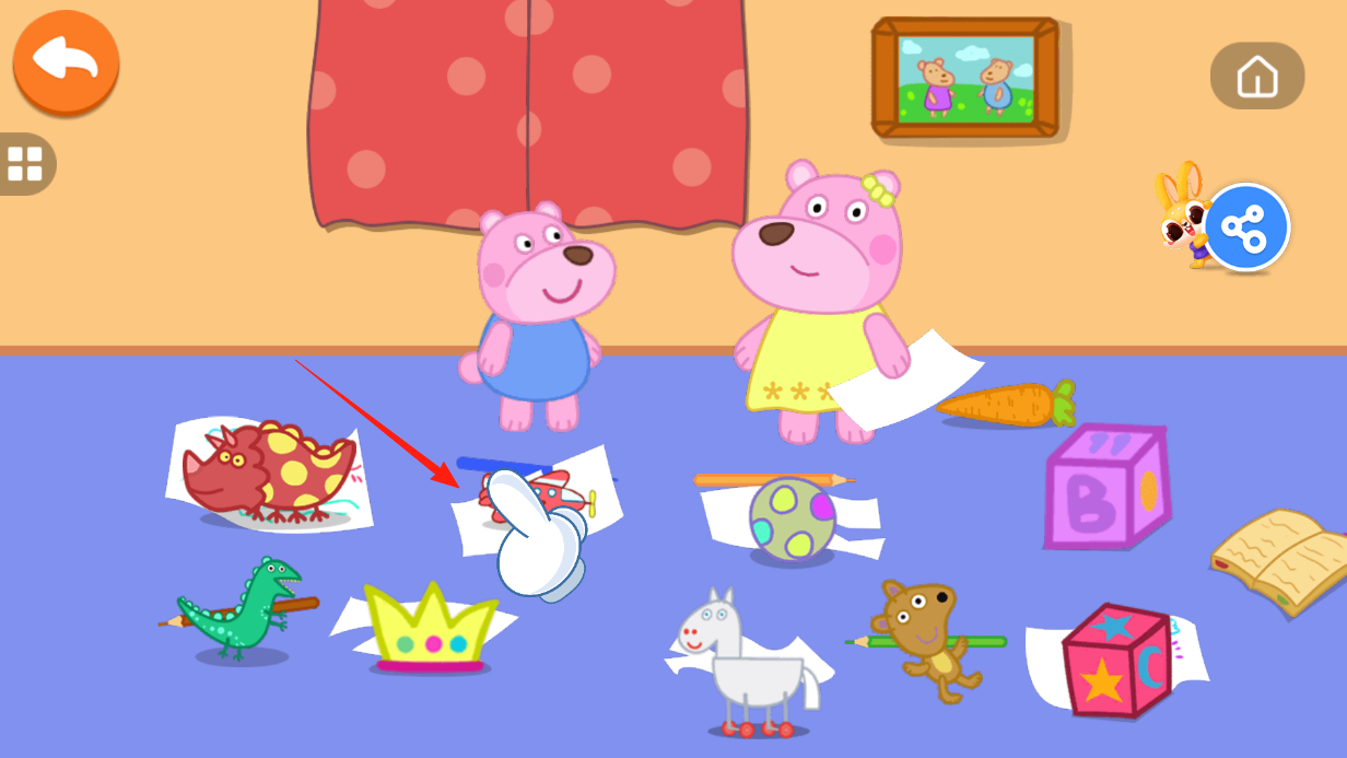 1、进入房间场景,看到散落的物品与角色,点击指定图纸,触发互动,借助物品收集机制,推进玩法流程,通过操作,开启新的内容模块,感受探索的基础乐趣。