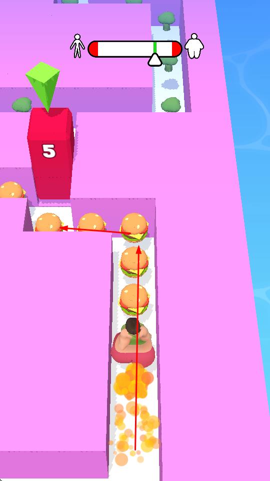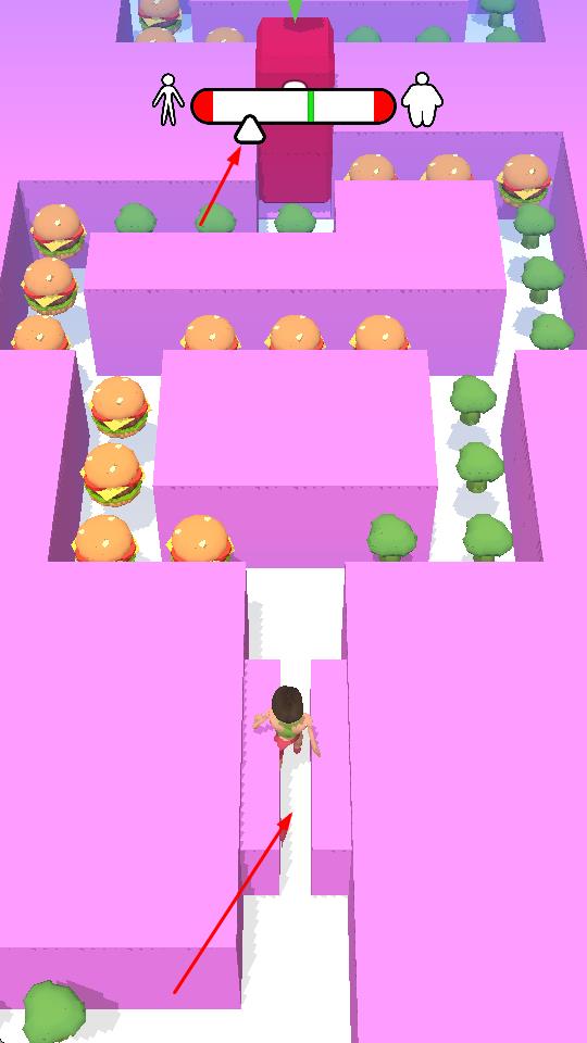2、躲避美食抵制诱惑:赛道上分布着汉堡等诱人美食,玩家需控制角色主动避开这些食物,抵制诱惑才能顺利推进闯关,同时避免因接触美食而影响闯关进度或增加难度。