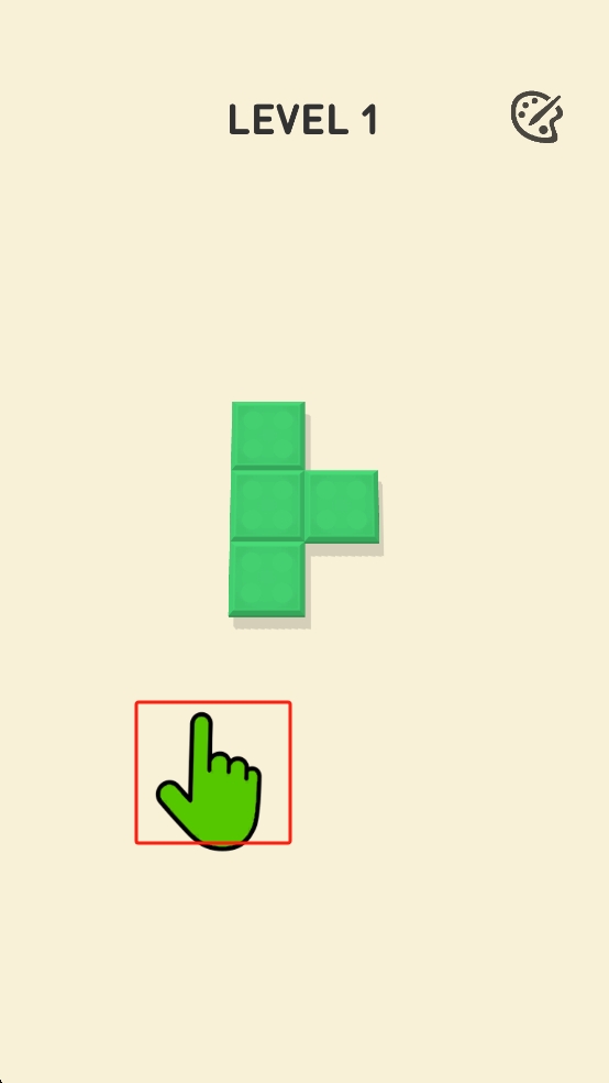 1、Level1阶段,跟随绿色指示手的引导,点击或操作绿色方块,完成该关卡的形状交互任务。