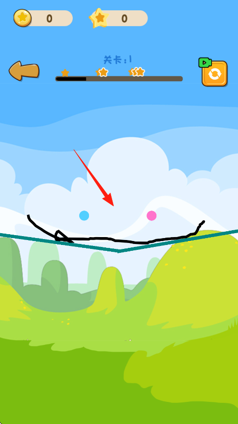 1、关卡1,用铅笔箭头指向在屏幕画线,为小球蓝、粉规划滚动路径,避开掉落,让球沿轨道移动。
