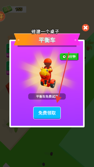 3、游戏中出现修建一个桌子提示时,可选择免费领取平衡车等道具,提升经营效率,推进游戏进程。