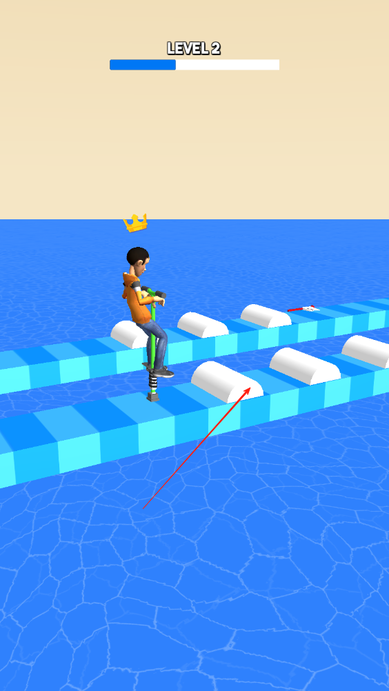 1、点击屏幕控制弹簧伸缩、长按调整弹力的基础操作,点击开始进入第一关,在简单赛道尝试操控弹簧完成短距离跳跃。