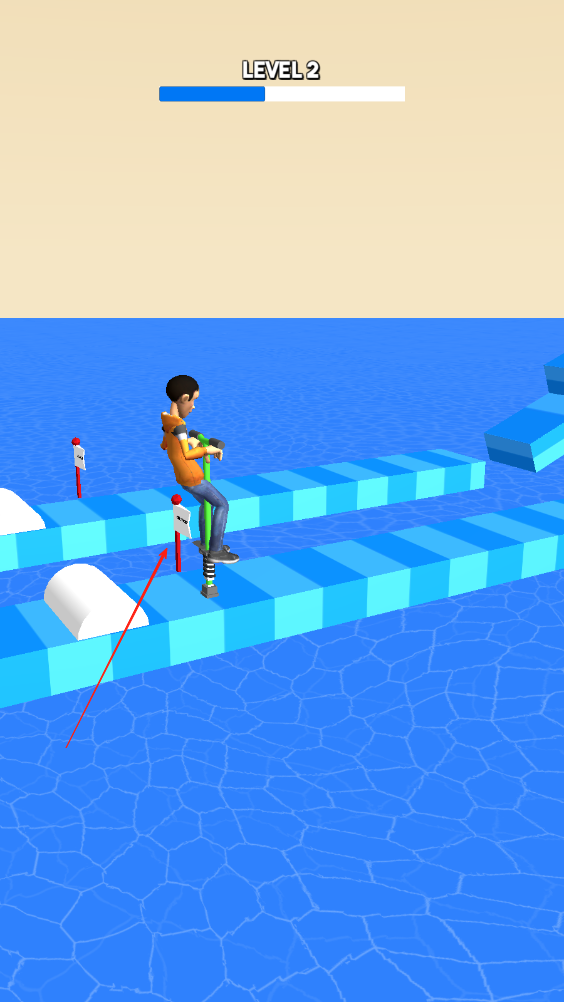 2、需精准控制弹簧的弹力与方向,通过跳跃躲避危险,红色旗子是复活点,如果不小心掉水里会从红色旗子点复活。。