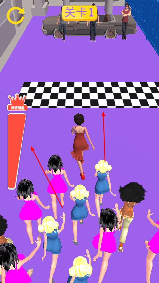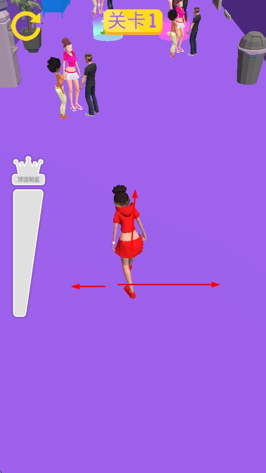 3、留意左侧的顶流明星进度条,根据场景变化合理规划移动策略,努力收集更多时尚物品,增加粉丝数量,率先抵达终点,完成关卡挑战。