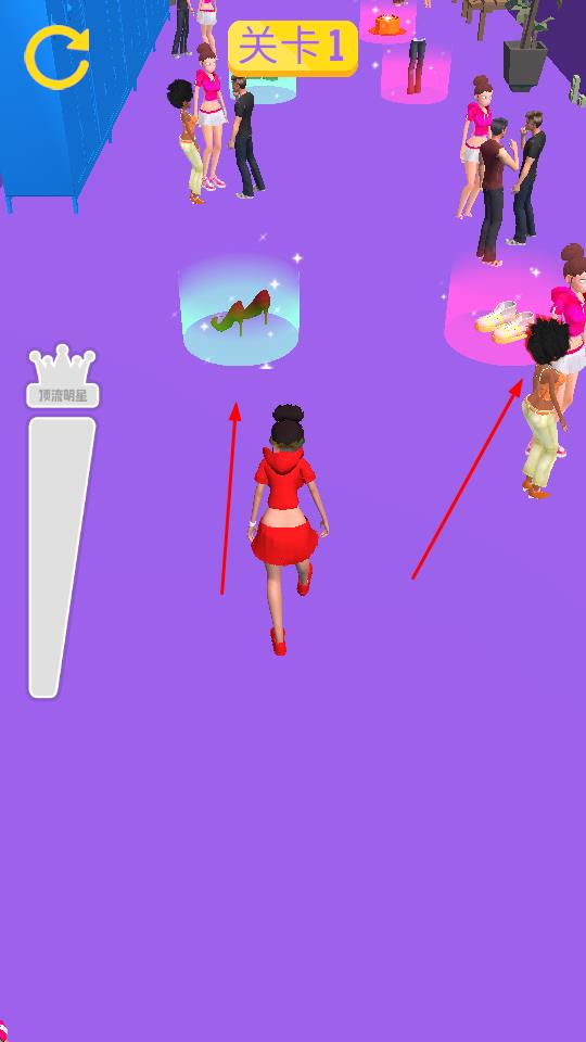 2、根据红色箭头提示,改变角色移动方向,收集散落在场景中的时尚物品,提升自身的时尚度。