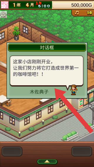 2、显示时间为1年4月上午6点,玩家拥有资金500,000G,有10点音乐值,对话框中角色木佐典子表示小店刚开业,要努力将其打造成世界第一的咖啡馆。