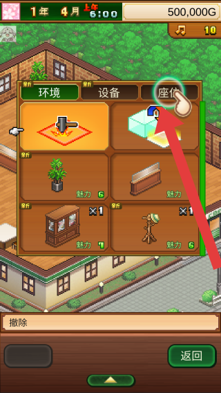 3、画面中是店铺布置界面,可选择环境、设备、座位相关设施布置咖啡馆,其中部分设施标注了魅力值。