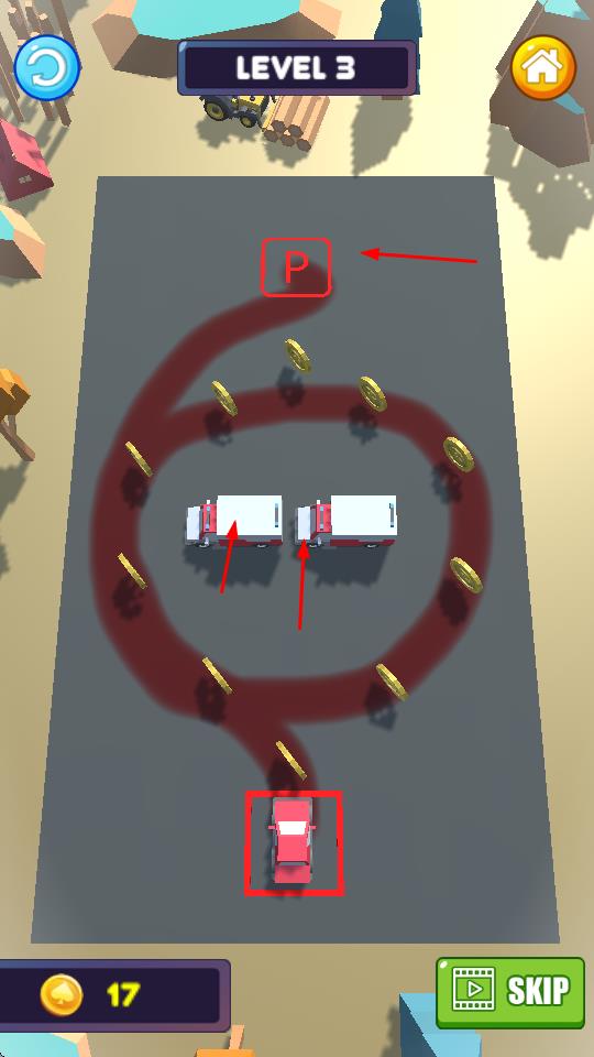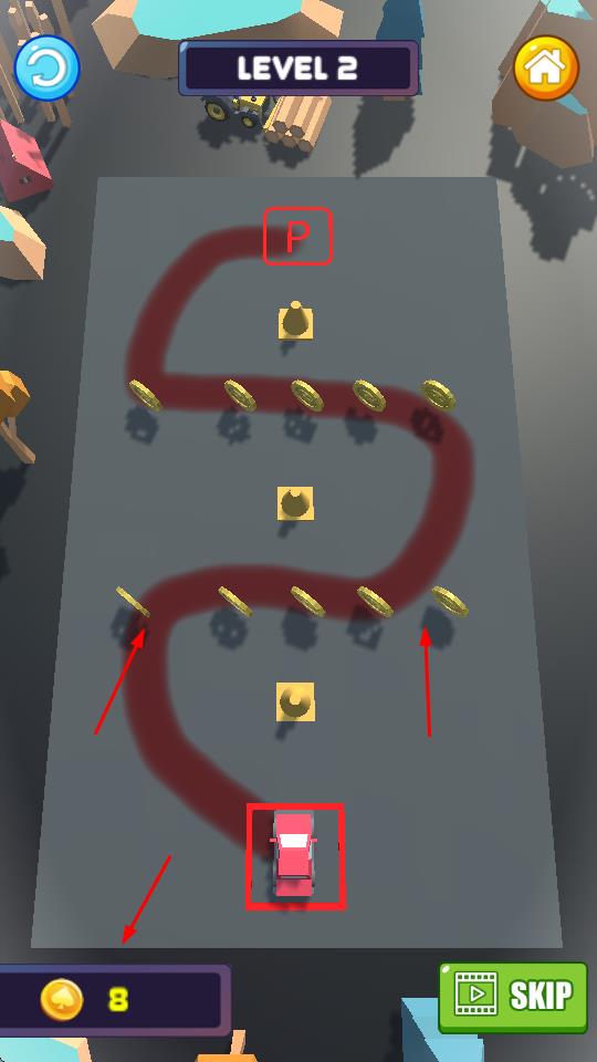 1、绘制路线引导停车:核心玩法是在屏幕上为汽车绘制行驶路线,路线需连接起点与指定停车位,同时避开障碍物、途经金币位置,车辆会严格沿路线行驶,直至完成停车。