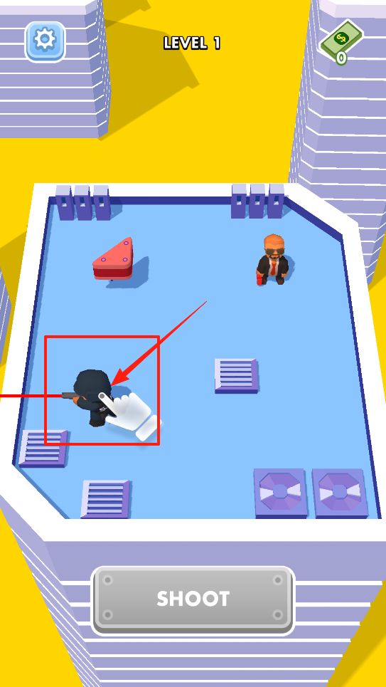 1、进入关卡1,操控黑衣角色移动,拖动角色调整位置,借助瞄准引导机制,对准目标方向,通过操作,规划射击路径,感受策略射击的初始布局乐趣。