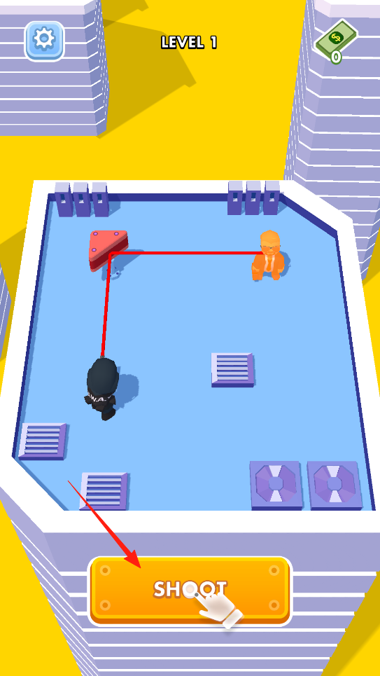 2、调整角色位置后,红色射线锁定目标,点击SHOOT,发射攻击,利用射线瞄准机制,精准打击敌人,通过操作,完成射击动作,体验命中目标的玩法,感受射击的爽快感。