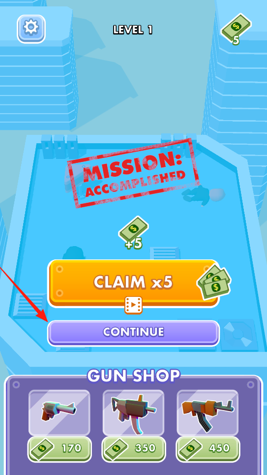 3、完成任务后,进入结算界面,点击CONTINUE,推进下一关,借助关卡延续机制,积累金币资源,通过操作,开启新挑战,感受任务完成后的进度推进乐趣。