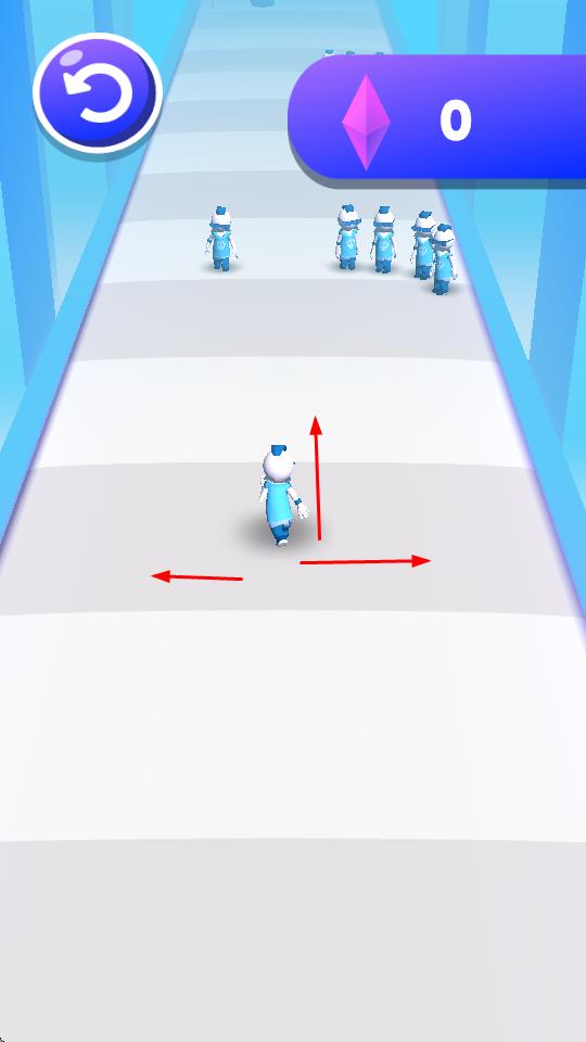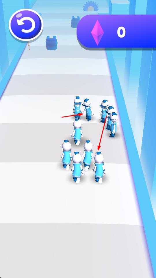 1、操控小人角色在跑道上移动,通过靠近其他相同颜色的小人,将其吸收到自己的军团中,增加军团规模。