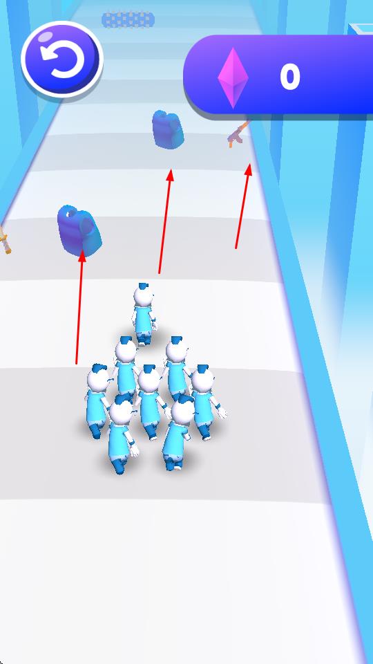 2、根据红色箭头提示,改变小人军团移动方向,避开障碍物,同时尽可能多地吸收小人,扩大军团规模。