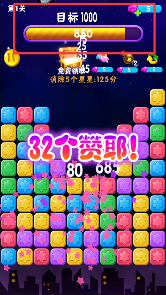 3、持续组合消除累积分数,当进度条达到关卡要求的数值时,画面会亮起提示通关的胜利动画效果。