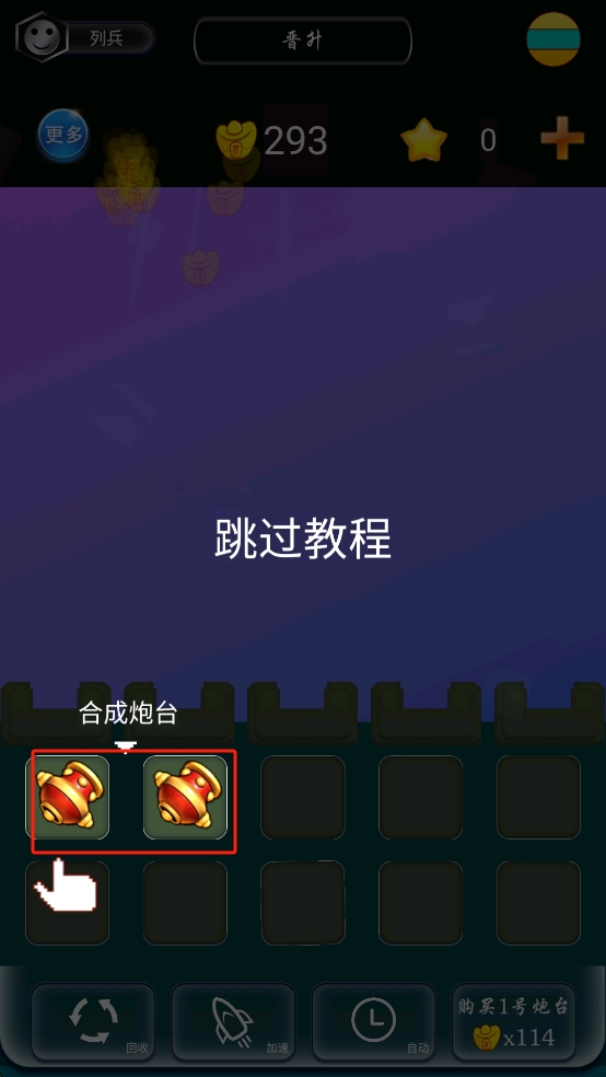 1、观察界面下方两个红色炮台,跟随指引完成合成操作,跳过教程推进流程,解锁炮台合成玩法,开启战斗布局基础。
