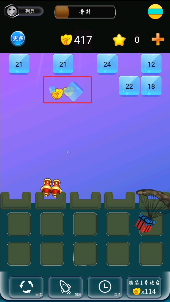 2、操控合成炮台攻击上方蓝色方块,击破后获取元宝资源,同时留意右侧降落伞礼包,争取更多收益助力炮台发展。