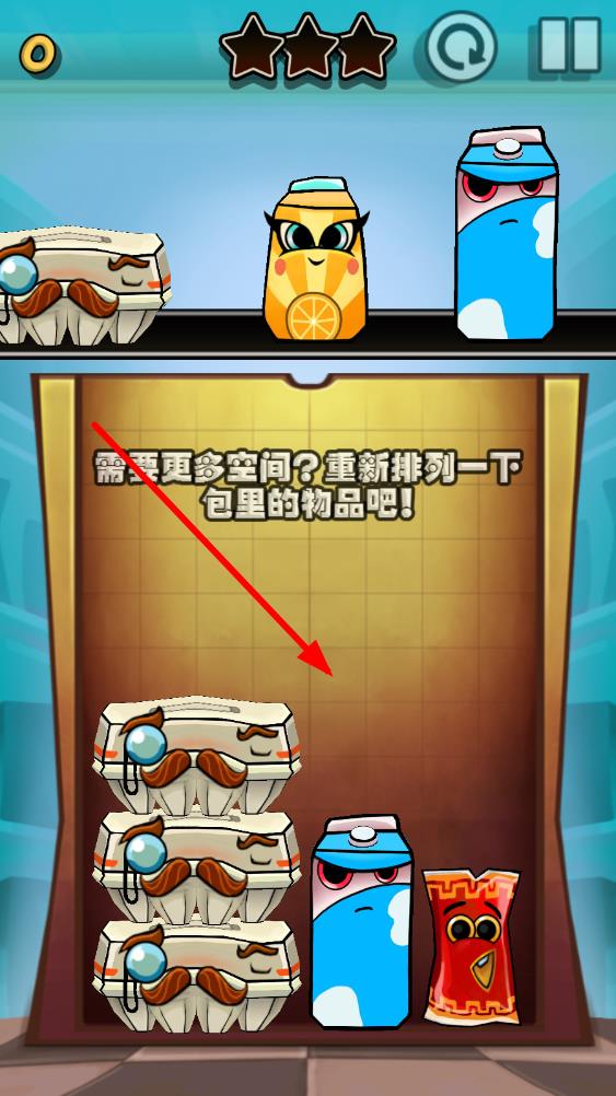 1、物品放置与压缩:判断物品压制关系,按顺序将物品放入袋中,用高等级物品压扁低等级物品,如先放果汁再放牛奶使其压缩,最后放西瓜压扁剩余物品,节省空间。