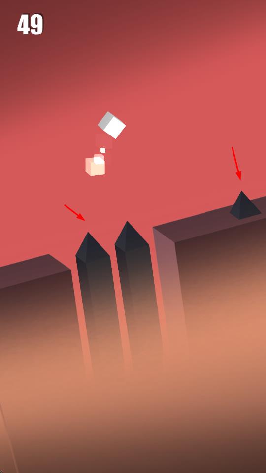 1、操控白色方块在红色背景的场景中移动,避开黑色的尖刺障碍物,同时收集粉色的小方块等道具。
