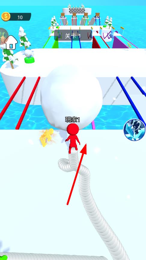 2、在正式关卡中,操控角色引导雪球沿赛道前进,避开树木、石块等障碍物,碾压地面的积雪让雪球不断变大,同时与其他队伍展开竞争。