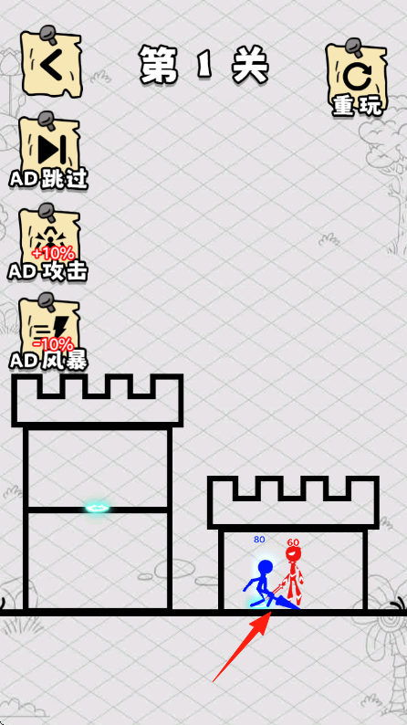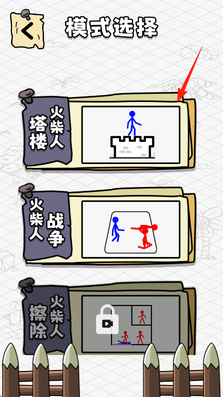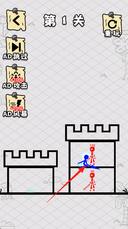 1、进入游戏在模式选择界面,可以选火柴人塔楼模式,进入第1关,操控蓝色火柴人,防御攻击红色敌人。