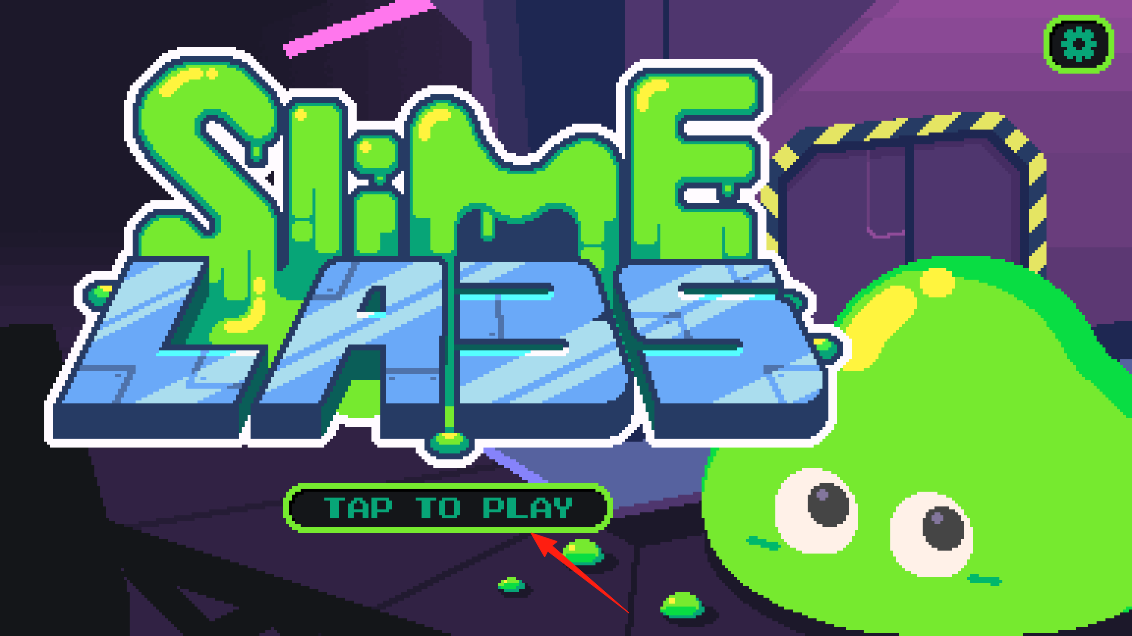 1、在游戏起始界面,点击TAP TO PLAY按钮,进入史莱姆实验室冒险,通过点击操作,开启游戏流程,操控史莱姆在场景中探索,体验像素风闯关玩法。