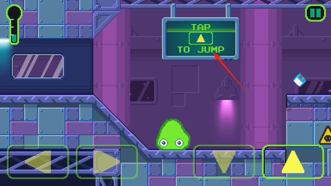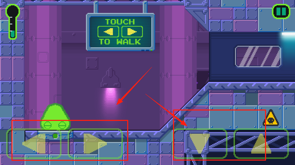 2、进入实验室场景,依据TOUCH TO WALK提示,点击左右方向区域,控制史莱姆移动,通过点击不同区域,让史莱姆在平台行走,躲避障碍,推进关卡进程,感受移动操控机制。
