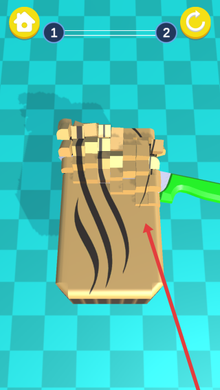 2、关卡内使用绿色刀具,按照提示通过滑动屏幕来控制切割棕色带纹路的物品,完成切割任务推进游戏。