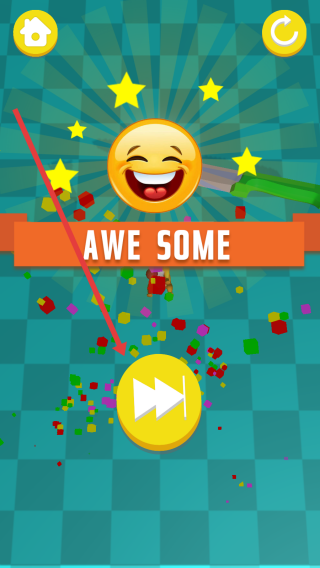 3、成功切割完成后出现AWESOME界面,通过点击黄色按钮,可以继续下一关或返回主界面。