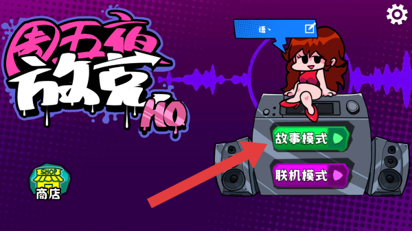 1、界面上有故事模式、联机模式的选项,还有商店按钮、角色形象以及设置图标等,点击故事模式方可进入。