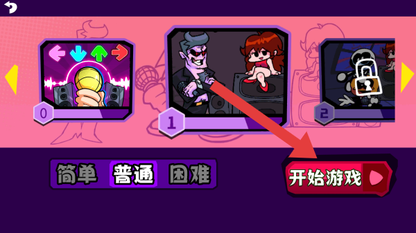2、显示的关卡0、1、2号关卡,2号关卡锁定、难度选择简单、普通、困难,点击开始游戏按钮,以及对应关卡的角色和场景图案。