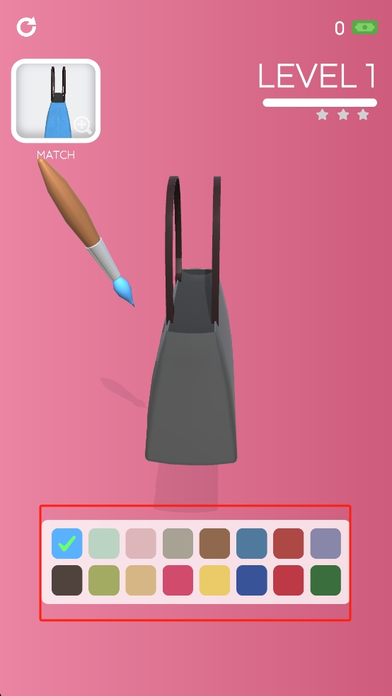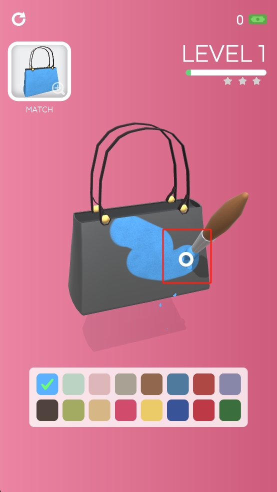 1、根据左上角预览图我们选择调色盘左侧带对勾的蓝色颜料,借助画笔工具,对灰色包包进行染色,开启定制流程。
