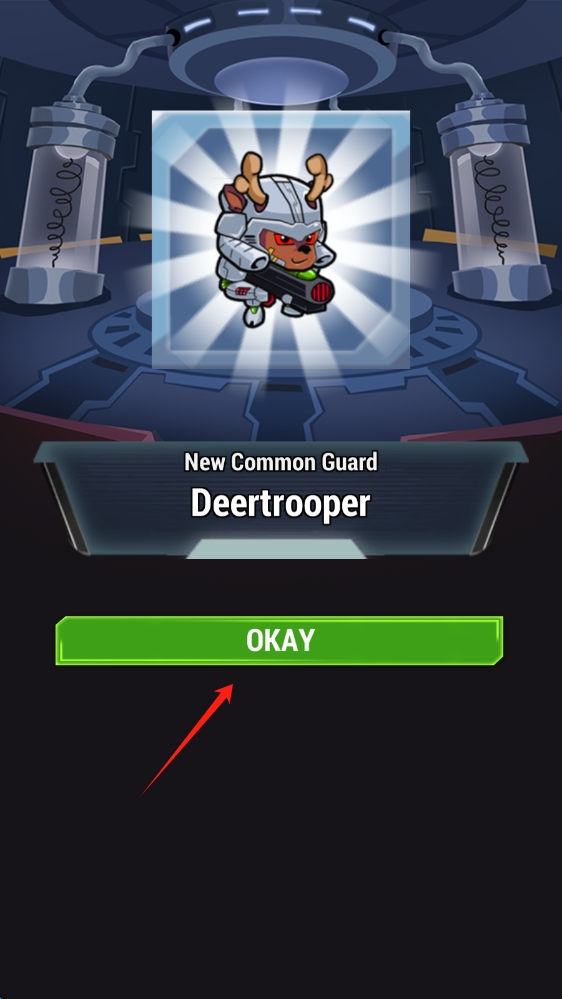 2、角色获取界面,点击OKAY,确认获取Deertrooper,将其纳入队伍,增强战力,点击确认。