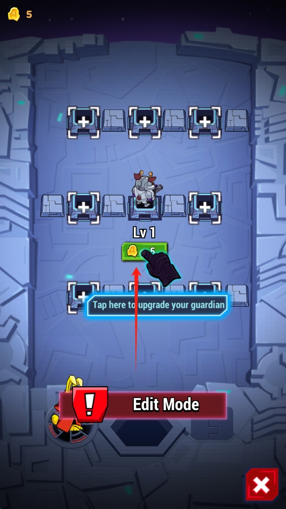 3、在升级界面,点击指定位置,消耗金币,升级Lv-1守卫,提升其属性与能力,点击升级。