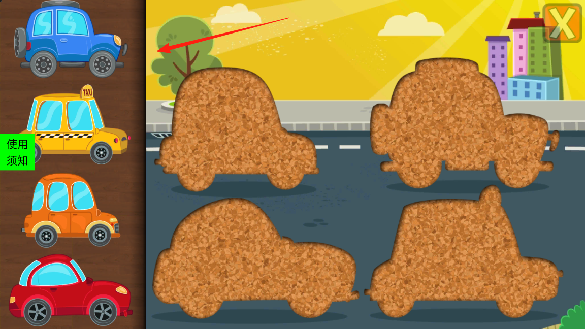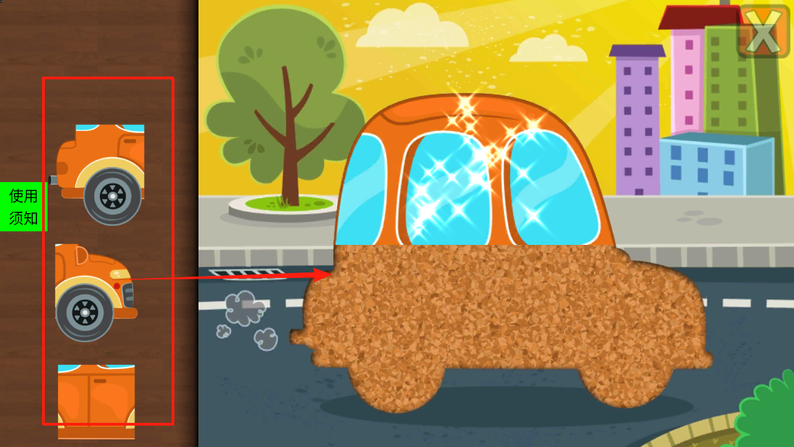2、进入拼图关卡,左侧显示完整汽车模型,右侧是汽车形状的拼图碎片,观察碎片轮廓与位置,拖动左侧汽车到对应碎片区域,完成拼图基础拼接,锻炼空间匹配能力。