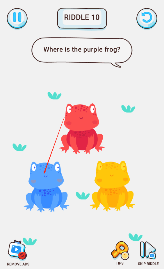 3、根据问题寻找紫色青蛙,场景中没有紫色青蛙,我们需要将蓝色青蛙和红色青蛙拖到一起,合成紫色的青蛙即可。