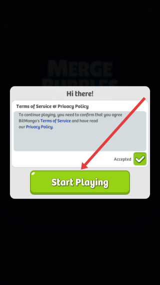 1、在MERGE-BUBBLES游戏初始界面,勾选同意条款后点击绿色Start-Playing按钮,进入游戏。