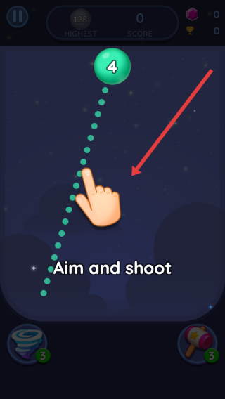 2、游戏中按照提示Aim-and-shoot,用手指瞄准方向发射带数字4的绿色泡泡,开始合并操作。