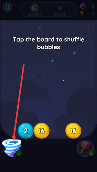 3、当出现Tap-the-board-to-shuffle-bubbles提示时,点击左下角漩涡状道具,重新排列泡泡。