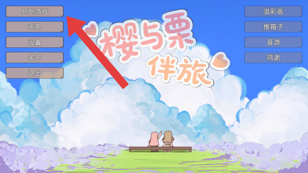 1、界面有功能按钮,点击开始游戏方可进入该场景,画面呈现两个角色坐在草地上看云朵的场景。