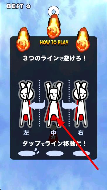 2、查看指引,需在3条线间躲避,点击左右区域或保持中间,滑动屏幕移动角色,避开火焰。