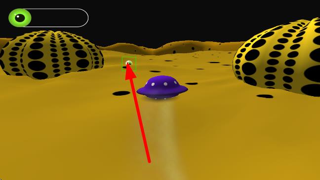 2、我们进入场景后,驾驶紫色飞碟,追踪箭头指向的绿色目标,在黄色地形移动,靠近收集。