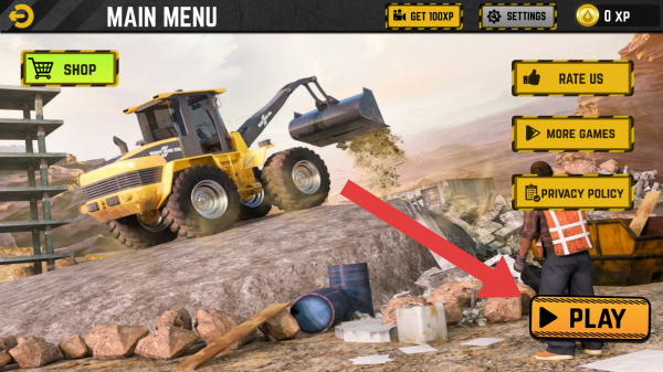 1、点击PLAY方可进入场景游玩,画面中有黄色挖掘机、穿着工装的人物,呈现施工场景,还有0XP显示。