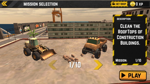 2、任务描述清理建筑屋顶,任务进度1/10,点击功能按钮PLAY开始游戏,画面中有装载机、卡车,呈现建筑屋顶施工场景。