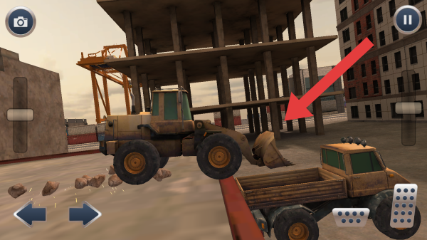 3、呈现建筑施工场景有未完工建筑、起重机等,界面有控制按钮方向、操作键、相机和暂停图标,展现车辆协同作业的内容。