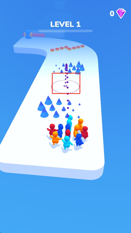 1、操控彩色小人队伍,朝红框内紫色路径移动,沿途收集紫色圆点,避开两侧蓝色尖刺,保持队伍完整,向关卡前方推进。