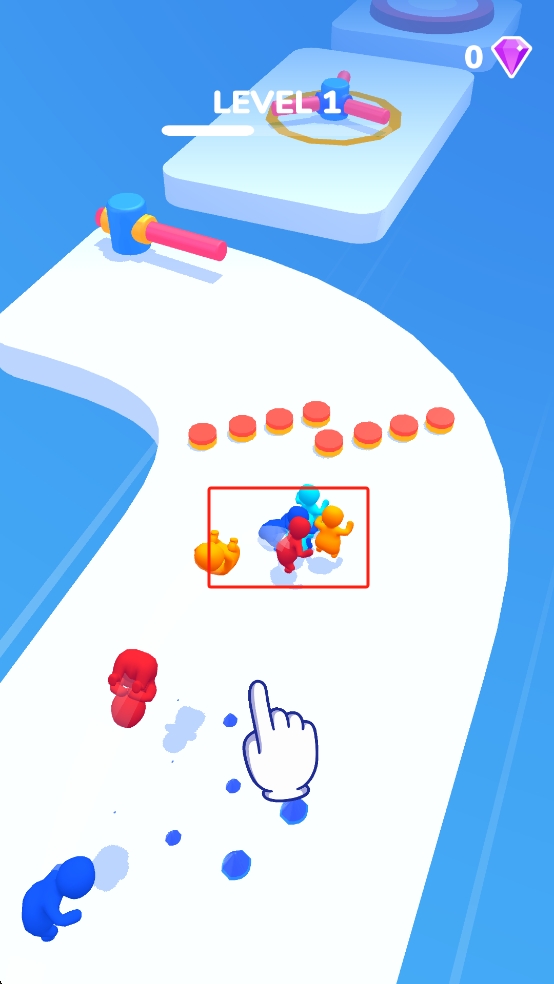2、跟随白色手指指引,让小人聚集在红框区域,借助滚动惯性通过路段,拾取橙色圆饼,躲避蓝色碎块,维持队伍人数。