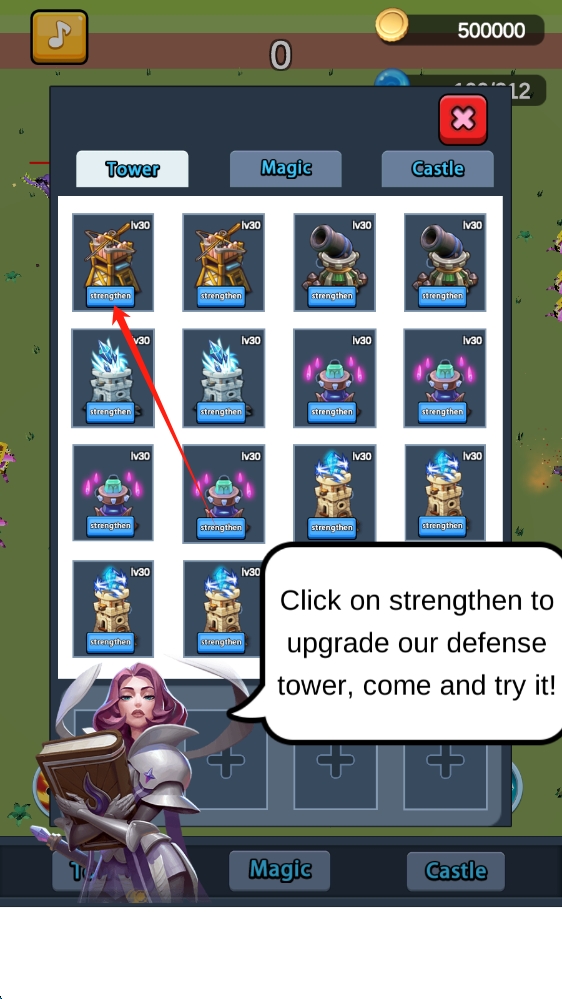 2、进入防御塔升级界面,跟随提示,点击strengthen,升级防御塔,增强防御能力,点击购买。