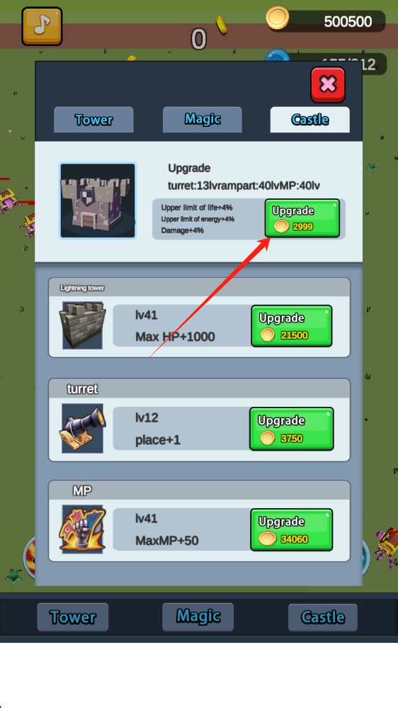 3、在城堡升级界面,点击Upgrade,升级城堡,增加生命值、能量上限和伤害,点击升级。