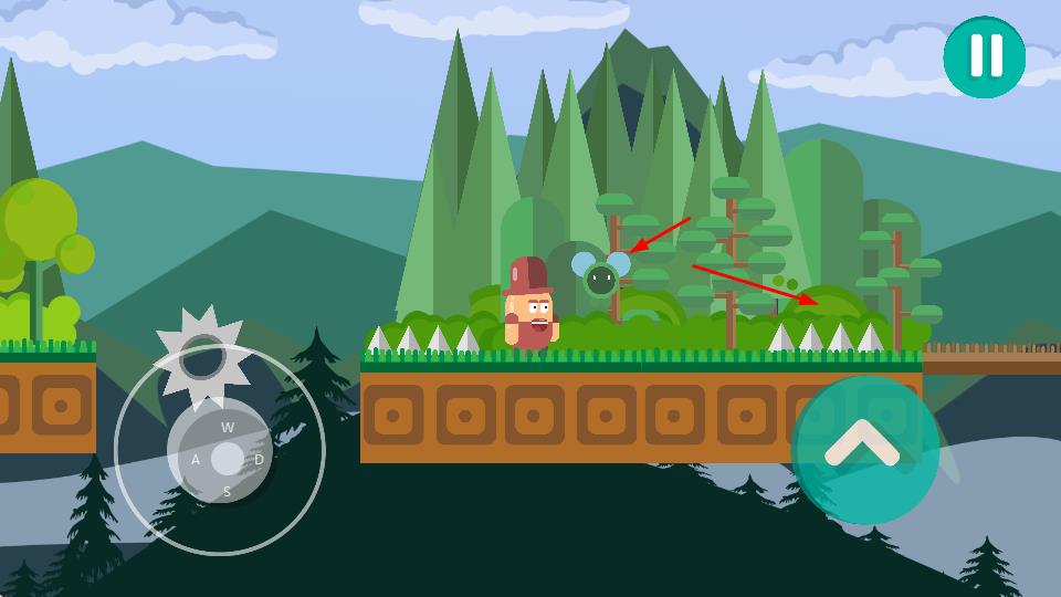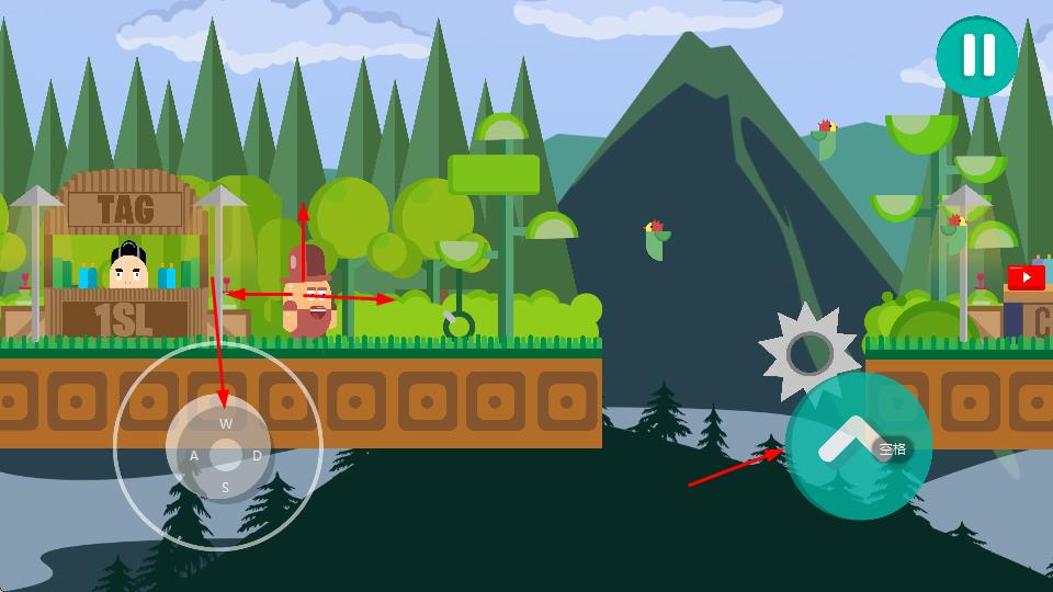 1、操控角色在森林背景的赛道上移动,利用虚拟方向键控制角色的移动方向,通过跳跃按钮让角色跳跃,避开障碍物。